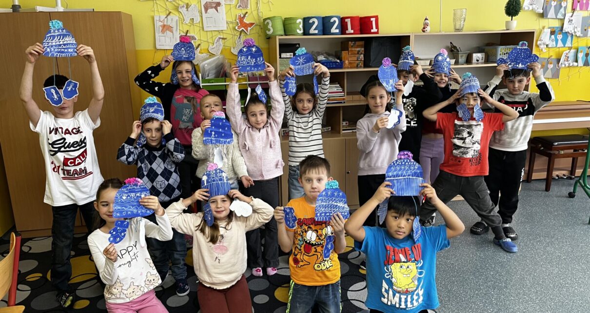 Žáci druhého ročníku se v hodinách ČSP proměnili v malé umělce a dle své fantazie vytvářeli zimní čepice a rukavici. Nejprve si natřeli čtvrtky inkoustem, po zaschnutí, pomocí zmizíku, do inkoustu kreslili originální vzory, které se na modrém podkladu postupně objevovaly. Bambule z krepového papíru dodaly výrobkům plastický efekt.