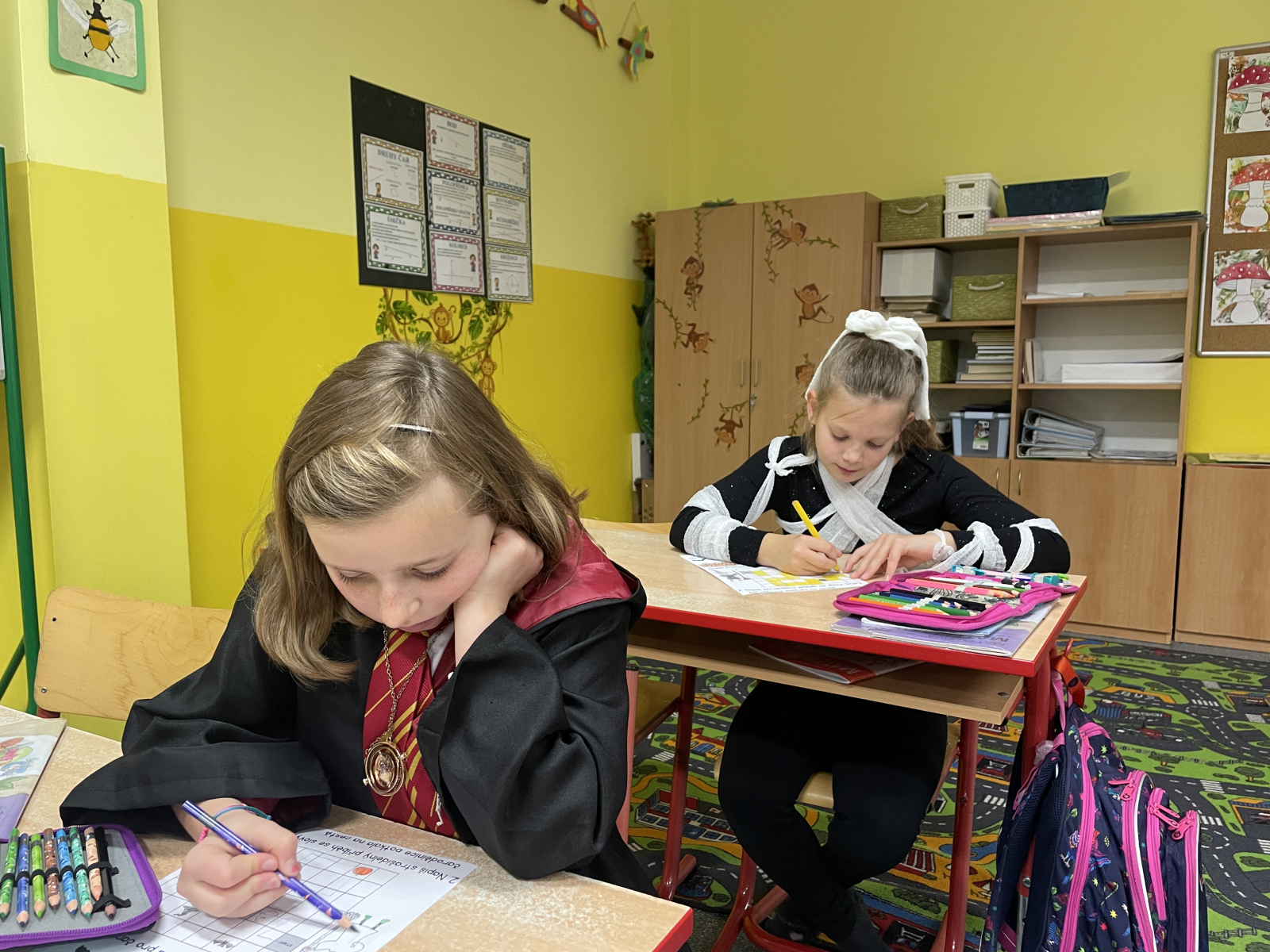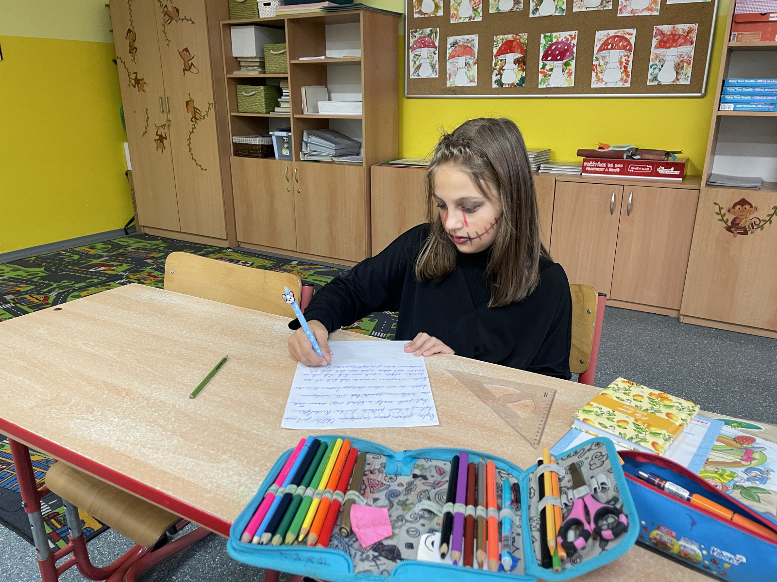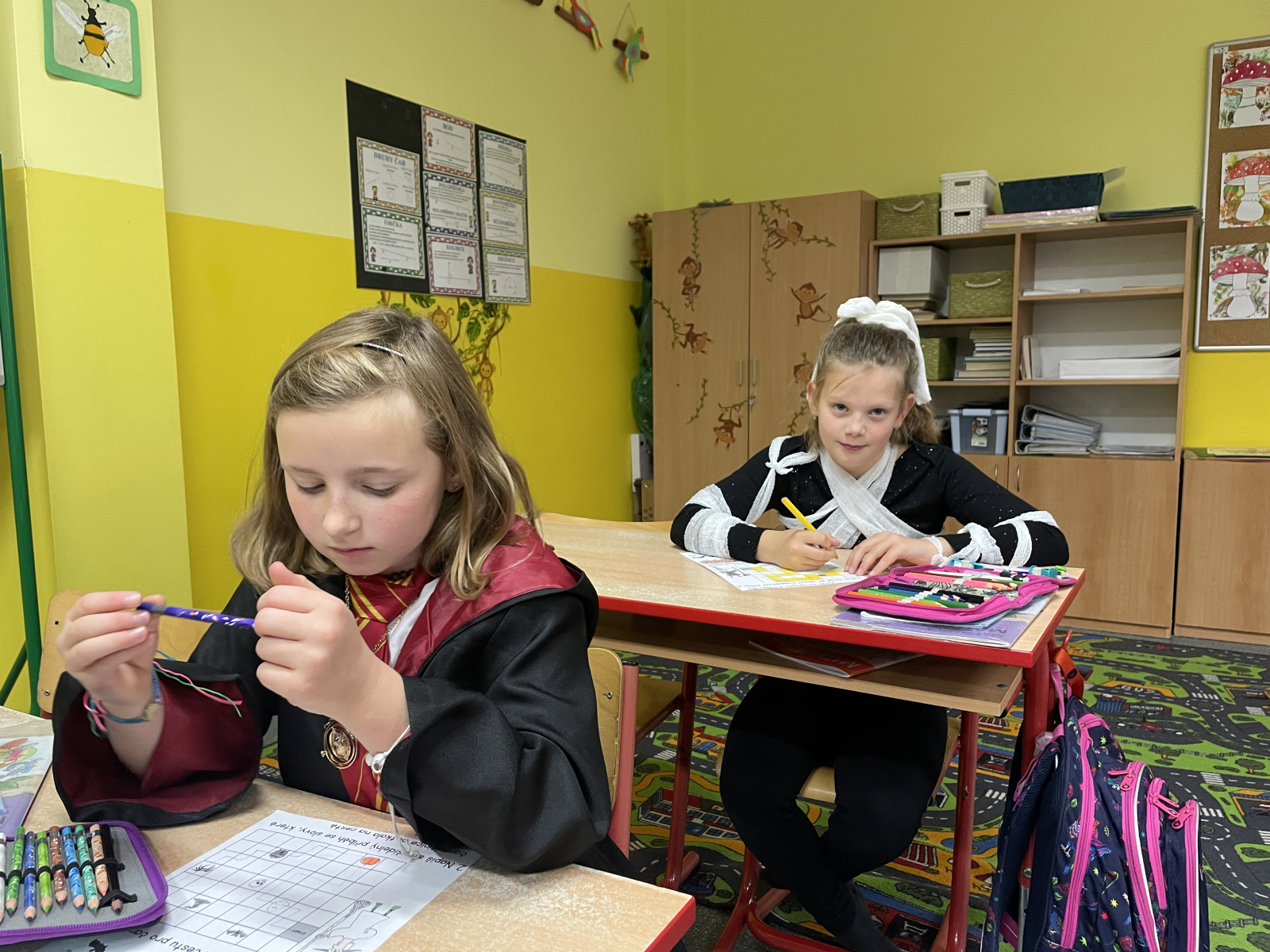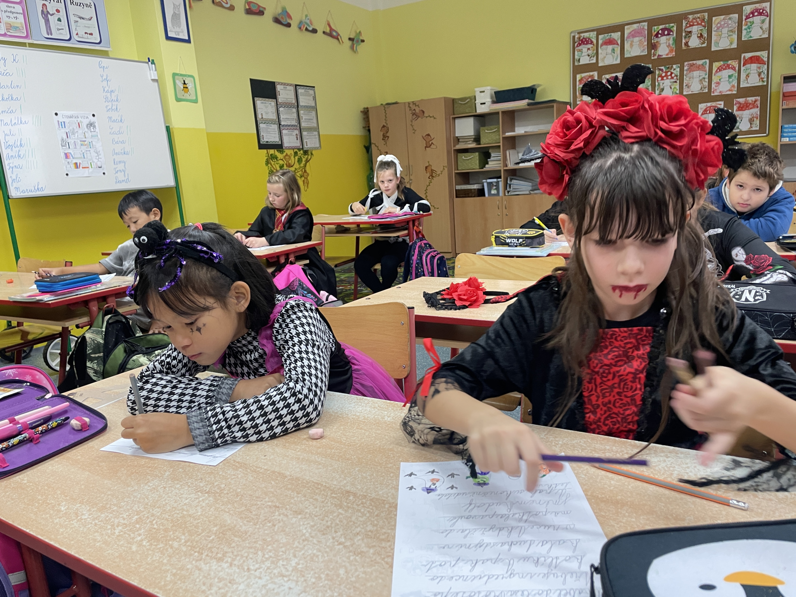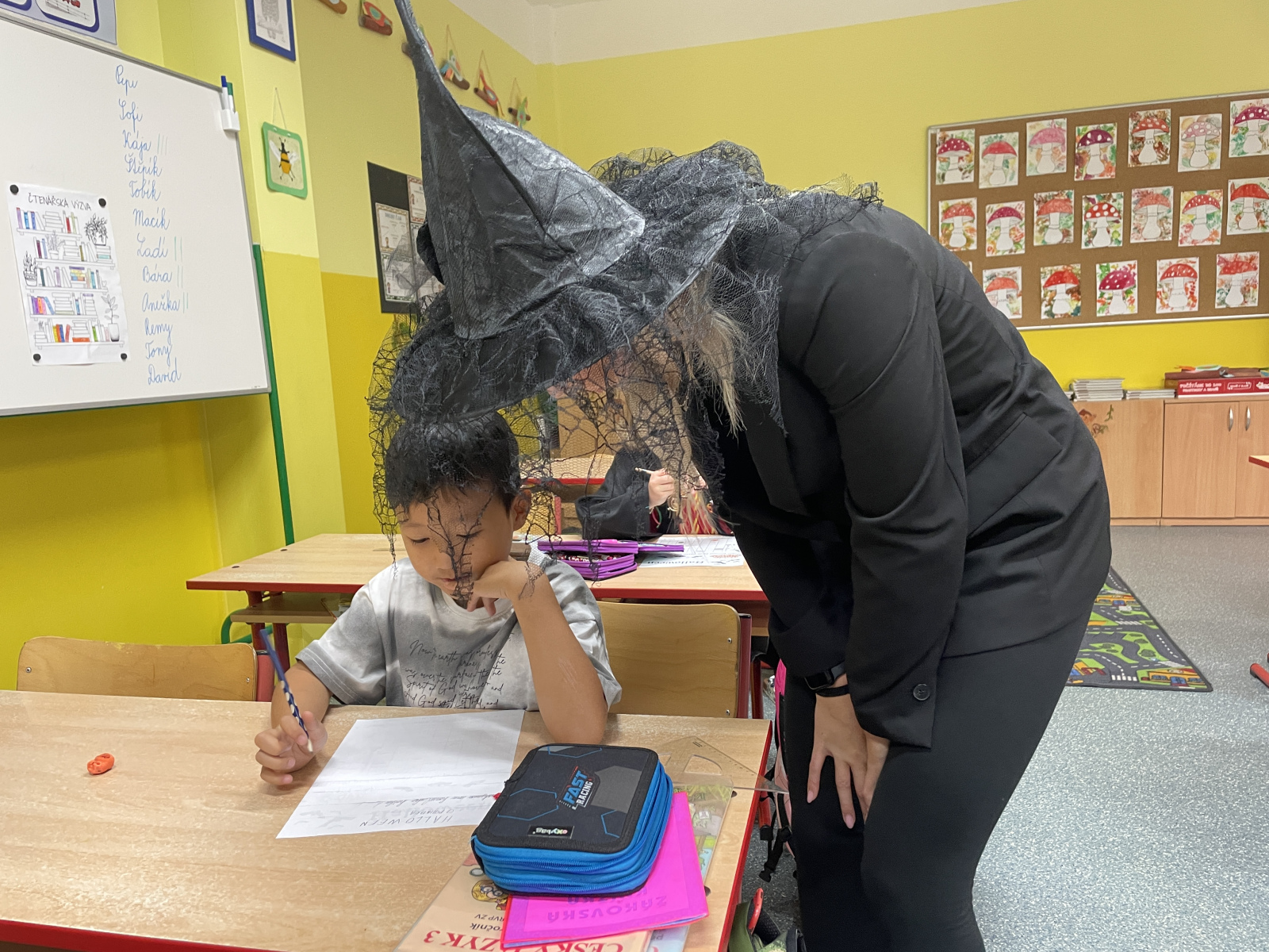 Ve třídě 3. A se letos Halloween nesl ve znamení her, tvořivosti a dobrodružství. Děti se převlékly do kostýmů a třídu zaplnili čarodějky, duchové, upíři a další strašidelná stvoření. Celý den žáci plnili úkoly a aktivity s halloweenskou tématikou. Na řadu přišlo také překvapení, které si pro ně přichystal druhý stupeň. Starší žáci připravili pro své mladší spolužáky soutěžní stanoviště s různými úkoly.