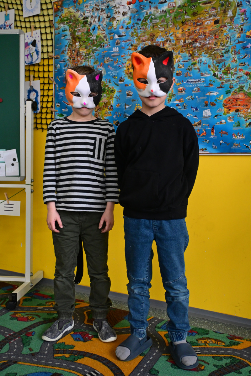 Barvení masek nás opravdu bavilo. Koťata měla báječné nápady a dokázala je při tvoření realizovat. Kočičí masku si všichni pěkně nazdobili, maminky vymyslely parádní kožíšky, ocásky, ba dokonce i tlapičky… A tak jsme se ve čtvrtek 19.2. vydali spolu se žáky celého prvního stupně na školní průvod chodbami naší školy. Koťata si moc přála potkat své starší kamarády anebo příbuzné, plácnout si s nimi a pozdravit je. V kočičí masce. Hrála nám do toho hudba, zadečky se kroutily, tamburýna cinkala. Zvládli jsme si o svačině sníst dobroty, co maminky nachystaly. Balonky poletovaly, klauni se smáli, bylo nám prima…