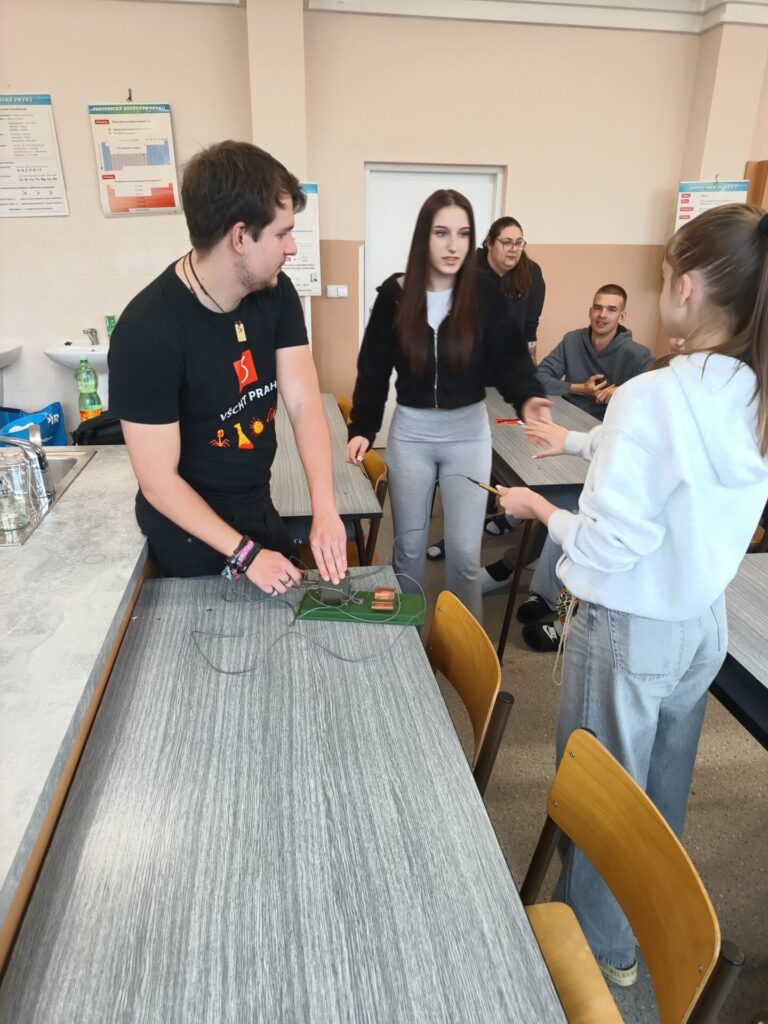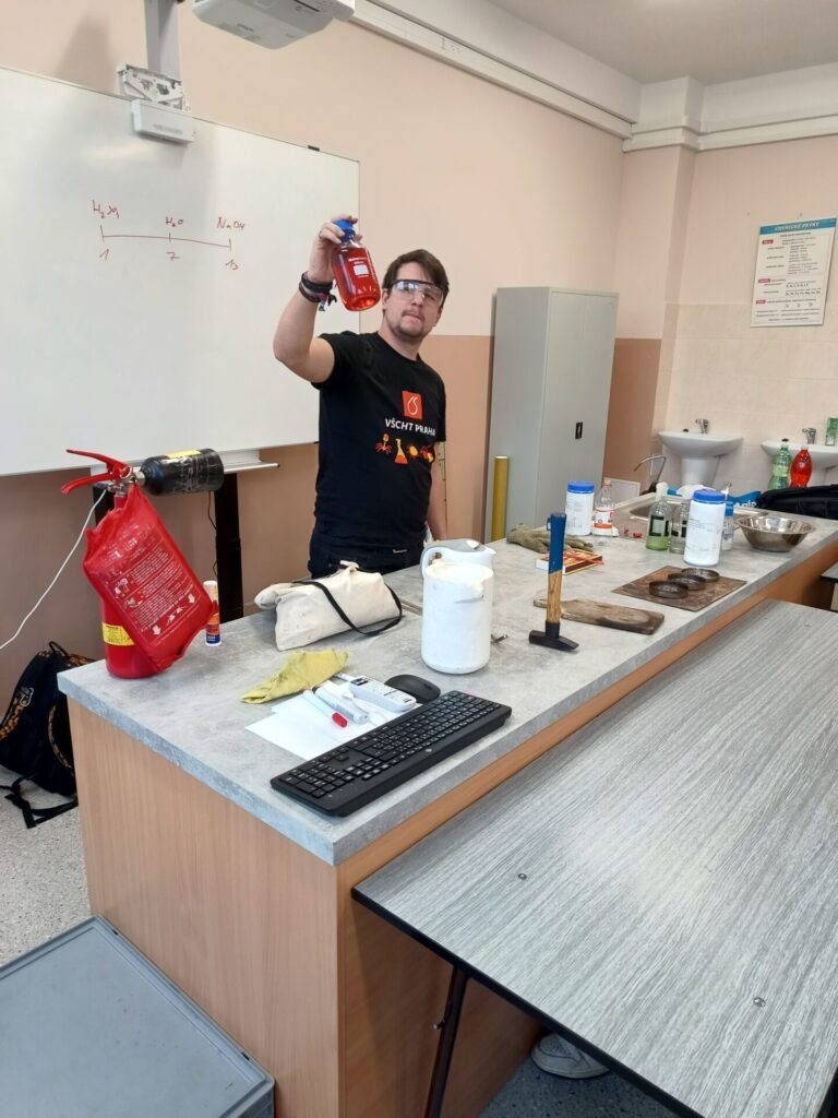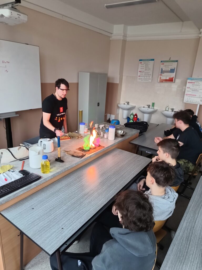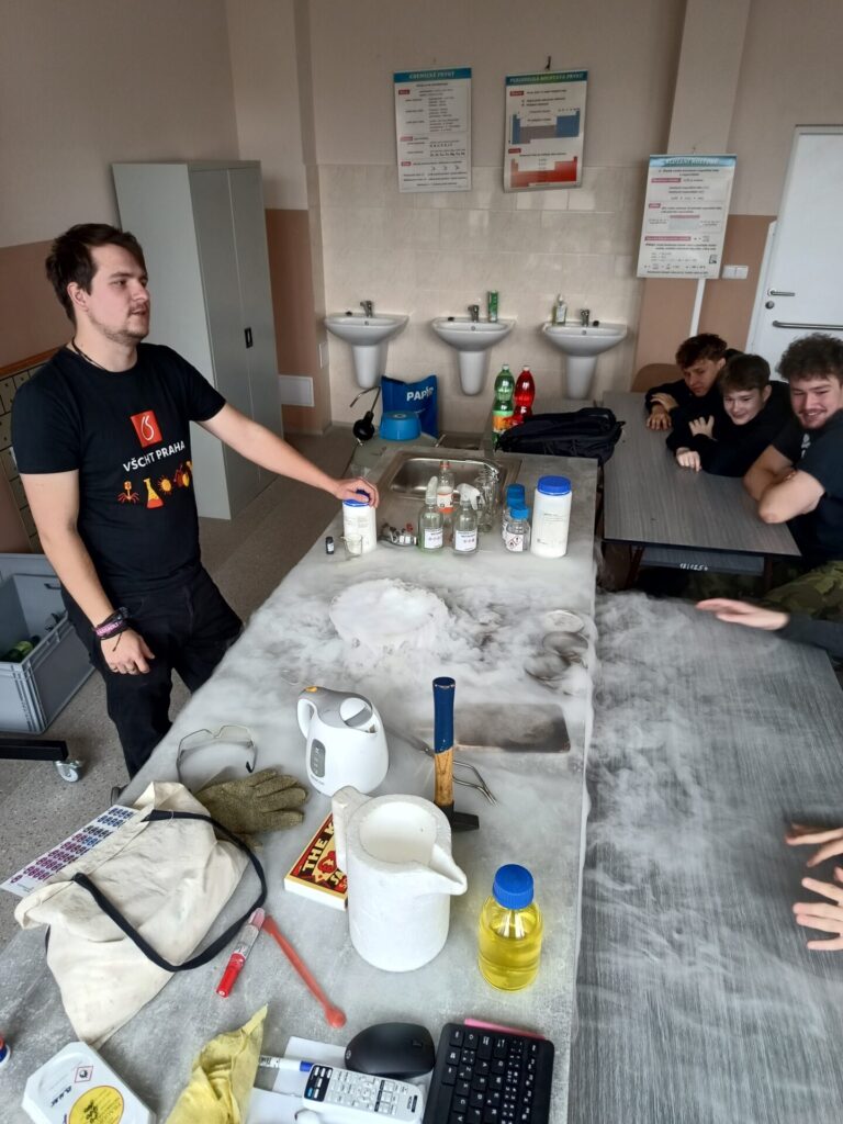 Dne 14.4.2026 jsme se vydali s osmáky a deváťáky na 3.ZŠ v Chodově, kde pod vedením doktoranda VŠCHT proběhla „Hodina moderní chemie“. Přednášející dokázal žáky vtáhnout do dění a ukázal jim, že chemie rozhodně nemusí být jen o učebnicích a vzorcích, ale i o překvapivých a efektních experimentech.