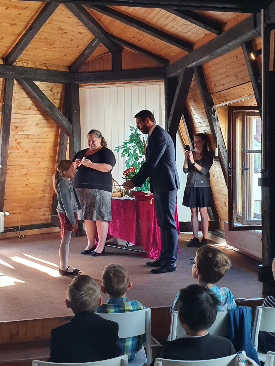 V úterý 14. 6. se v Městské knihovně konala velká sláva. Naši prvňáčci byli pasováni na čtenáře. Tohoto významného slavnostního ceremoniálu se výtečně zhostil pan starosta Patrik Pizinger. Před samotným pasováním všechny pobavilo milé vystoupení dua Dubnička a Lahoda. Pánové zahráli a zazpívali pár písní z vlastní tvorby, které se dětem moc líbily. A pak konečně nastala dlouho očekávaná chvíle. Žáci společně složili slib, že budou dobrými čtenáři a pak jednotlivě chodili k panu starostovi, který je obrovským mečem pasoval na čtenáře. Každý žák si odnesl na památku slib, knížku Dubánci, pár upomínkových předmětů a kartičku čtenáře, s níž mohou děti chodit do knihovny půjčovat si knihy. Po skončení pasování jsme se přesunuli do dětského oddělení, kde si žáci vybrali svou první knihu k vypůjčení.