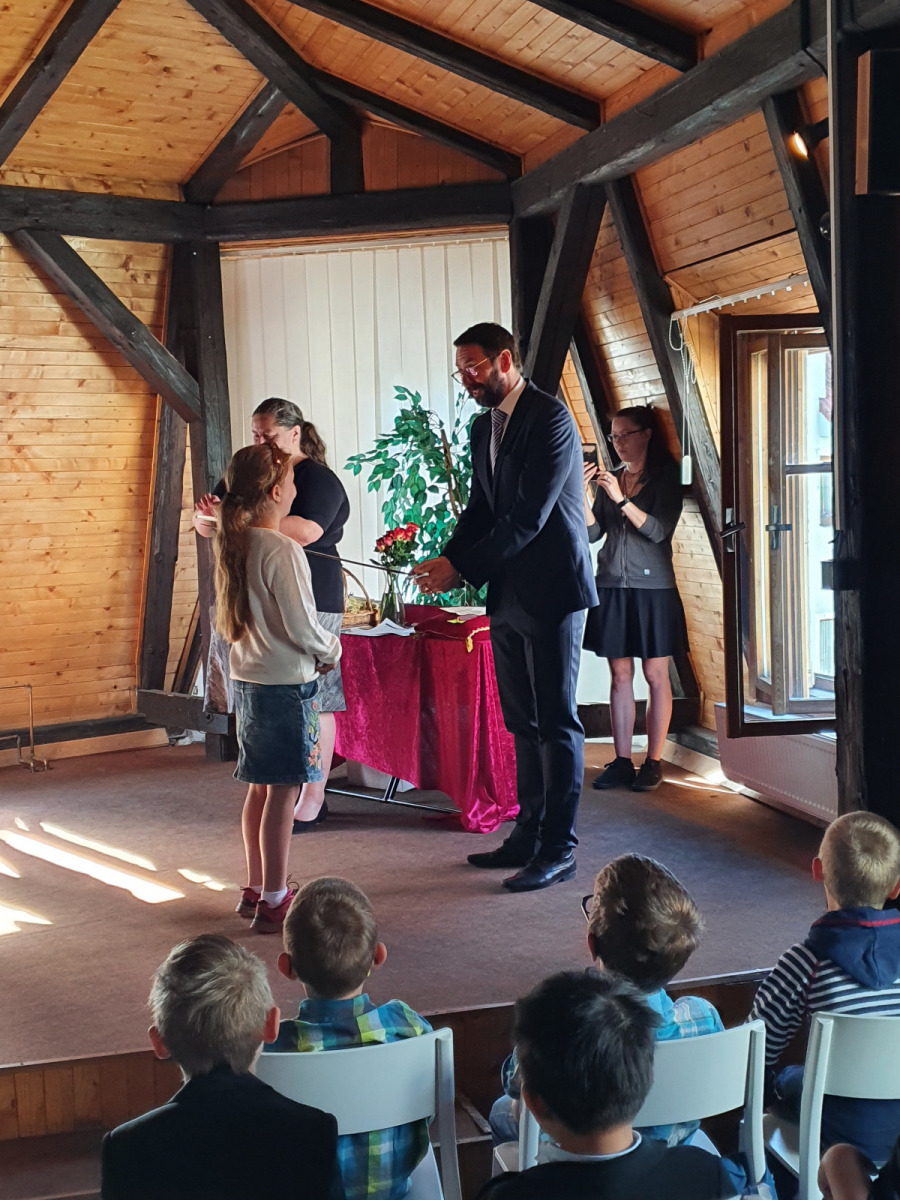 V úterý 14. 6. se v Městské knihovně konala velká sláva. Naši prvňáčci byli pasováni na čtenáře. Tohoto významného slavnostního ceremoniálu se výtečně zhostil pan starosta Patrik Pizinger. Před samotným pasováním všechny pobavilo milé vystoupení dua Dubnička a Lahoda. Pánové zahráli a zazpívali pár písní z vlastní tvorby, které se dětem moc líbily. A pak konečně nastala dlouho očekávaná chvíle. Žáci společně složili slib, že budou dobrými čtenáři a pak jednotlivě chodili k panu starostovi, který je obrovským mečem pasoval na čtenáře. Každý žák si odnesl na památku slib, knížku Dubánci, pár upomínkových předmětů a kartičku čtenáře, s níž mohou děti chodit do knihovny půjčovat si knihy. Po skončení pasování jsme se přesunuli do dětského oddělení, kde si žáci vybrali svou první knihu k vypůjčení.