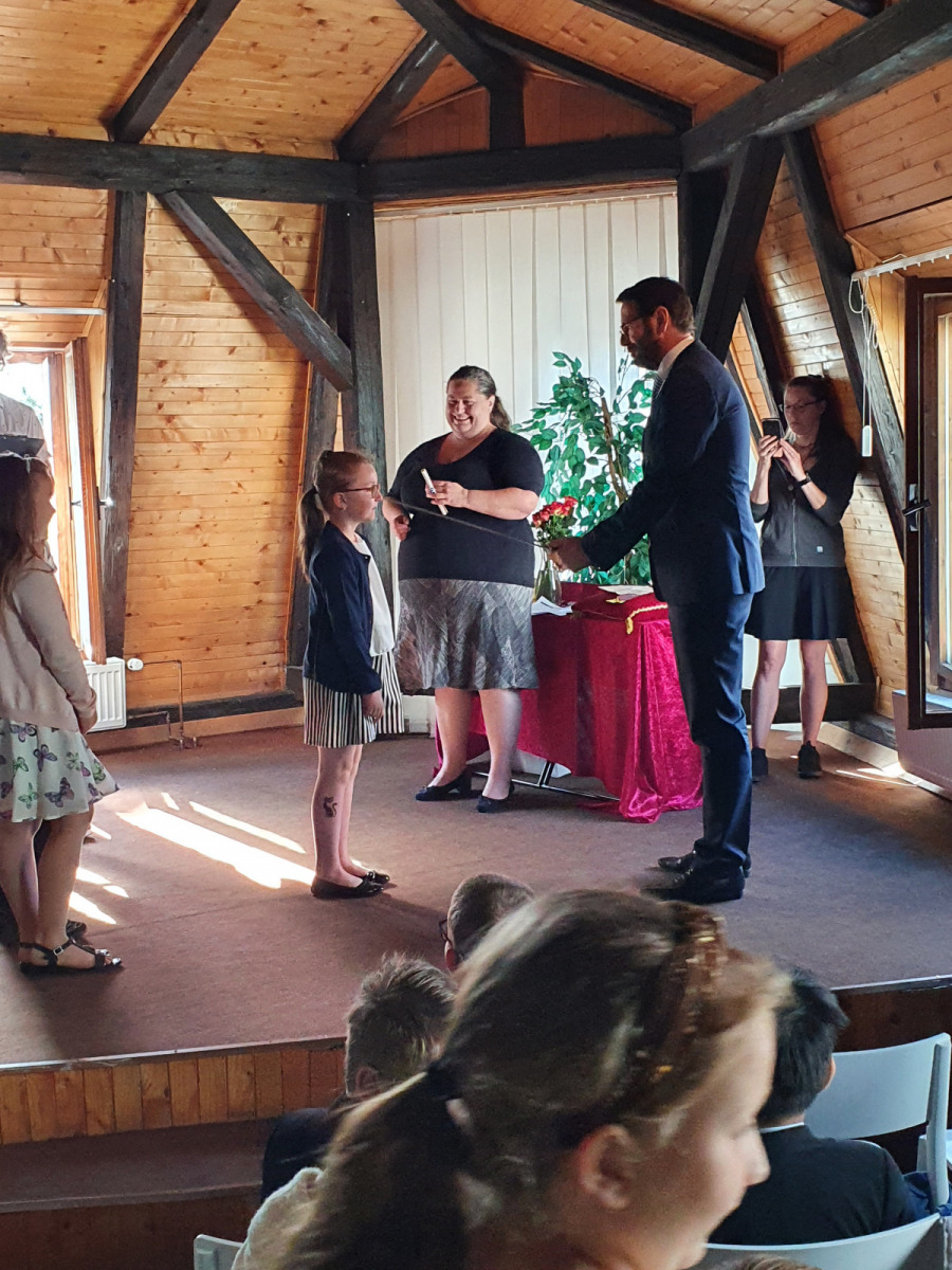 V úterý 14. 6. se v Městské knihovně konala velká sláva. Naši prvňáčci byli pasováni na čtenáře. Tohoto významného slavnostního ceremoniálu se výtečně zhostil pan starosta Patrik Pizinger. Před samotným pasováním všechny pobavilo milé vystoupení dua Dubnička a Lahoda. Pánové zahráli a zazpívali pár písní z vlastní tvorby, které se dětem moc líbily. A pak konečně nastala dlouho očekávaná chvíle. Žáci společně složili slib, že budou dobrými čtenáři a pak jednotlivě chodili k panu starostovi, který je obrovským mečem pasoval na čtenáře. Každý žák si odnesl na památku slib, knížku Dubánci, pár upomínkových předmětů a kartičku čtenáře, s níž mohou děti chodit do knihovny půjčovat si knihy. Po skončení pasování jsme se přesunuli do dětského oddělení, kde si žáci vybrali svou první knihu k vypůjčení.