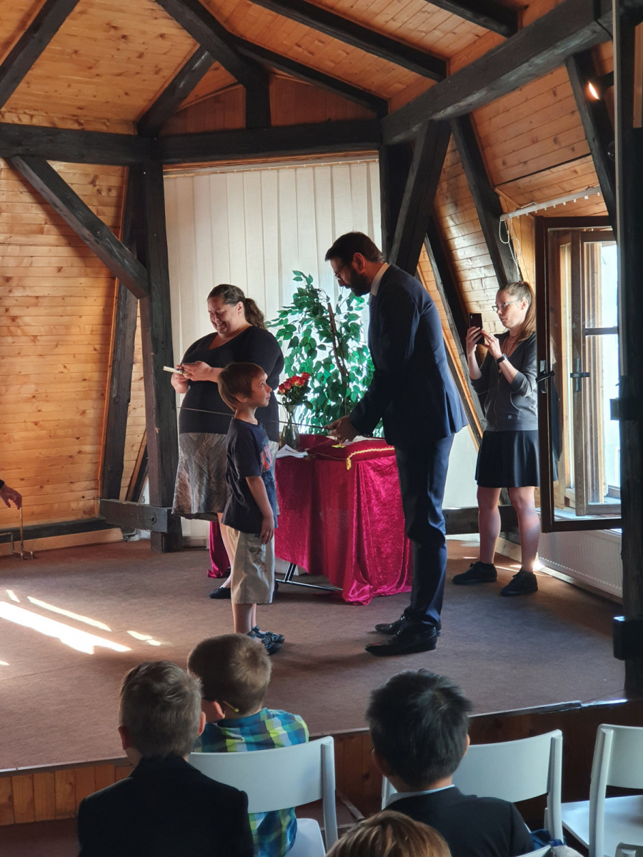V úterý 14. 6. se v Městské knihovně konala velká sláva. Naši prvňáčci byli pasováni na čtenáře. Tohoto významného slavnostního ceremoniálu se výtečně zhostil pan starosta Patrik Pizinger. Před samotným pasováním všechny pobavilo milé vystoupení dua Dubnička a Lahoda. Pánové zahráli a zazpívali pár písní z vlastní tvorby, které se dětem moc líbily. A pak konečně nastala dlouho očekávaná chvíle. Žáci společně složili slib, že budou dobrými čtenáři a pak jednotlivě chodili k panu starostovi, který je obrovským mečem pasoval na čtenáře. Každý žák si odnesl na památku slib, knížku Dubánci, pár upomínkových předmětů a kartičku čtenáře, s níž mohou děti chodit do knihovny půjčovat si knihy. Po skončení pasování jsme se přesunuli do dětského oddělení, kde si žáci vybrali svou první knihu k vypůjčení.