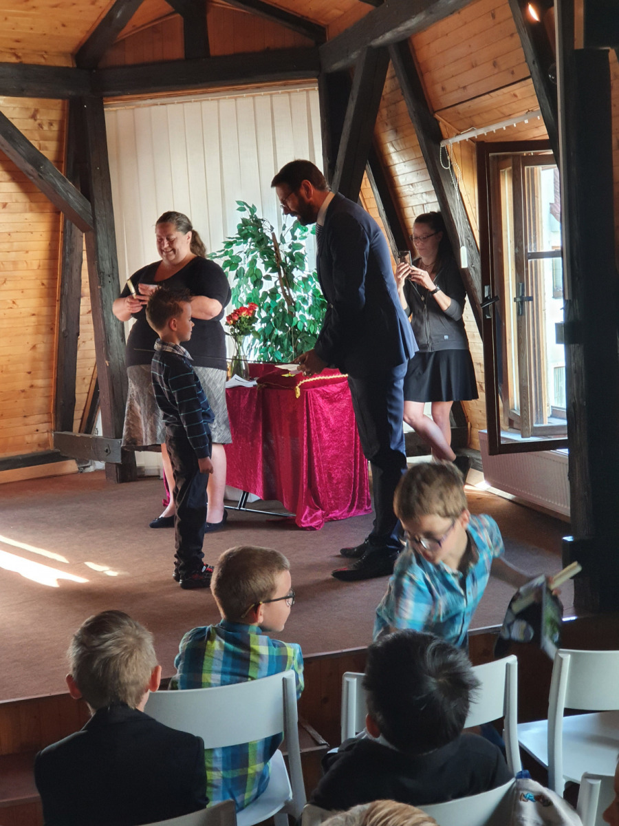 V úterý 14. 6. se v Městské knihovně konala velká sláva. Naši prvňáčci byli pasováni na čtenáře. Tohoto významného slavnostního ceremoniálu se výtečně zhostil pan starosta Patrik Pizinger. Před samotným pasováním všechny pobavilo milé vystoupení dua Dubnička a Lahoda. Pánové zahráli a zazpívali pár písní z vlastní tvorby, které se dětem moc líbily. A pak konečně nastala dlouho očekávaná chvíle. Žáci společně složili slib, že budou dobrými čtenáři a pak jednotlivě chodili k panu starostovi, který je obrovským mečem pasoval na čtenáře. Každý žák si odnesl na památku slib, knížku Dubánci, pár upomínkových předmětů a kartičku čtenáře, s níž mohou děti chodit do knihovny půjčovat si knihy. Po skončení pasování jsme se přesunuli do dětského oddělení, kde si žáci vybrali svou první knihu k vypůjčení.