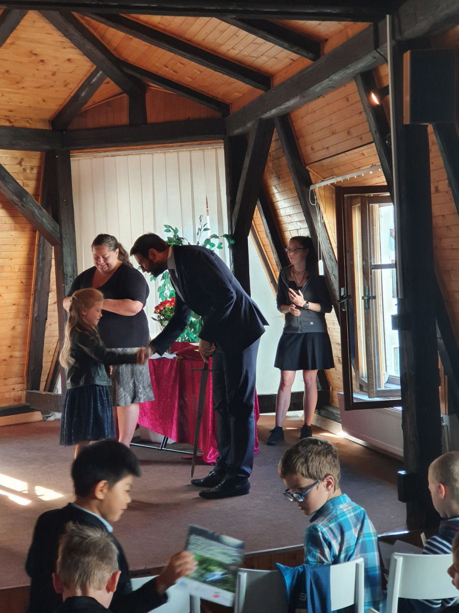 V úterý 14. 6. se v Městské knihovně konala velká sláva. Naši prvňáčci byli pasováni na čtenáře. Tohoto významného slavnostního ceremoniálu se výtečně zhostil pan starosta Patrik Pizinger. Před samotným pasováním všechny pobavilo milé vystoupení dua Dubnička a Lahoda. Pánové zahráli a zazpívali pár písní z vlastní tvorby, které se dětem moc líbily. A pak konečně nastala dlouho očekávaná chvíle. Žáci společně složili slib, že budou dobrými čtenáři a pak jednotlivě chodili k panu starostovi, který je obrovským mečem pasoval na čtenáře. Každý žák si odnesl na památku slib, knížku Dubánci, pár upomínkových předmětů a kartičku čtenáře, s níž mohou děti chodit do knihovny půjčovat si knihy. Po skončení pasování jsme se přesunuli do dětského oddělení, kde si žáci vybrali svou první knihu k vypůjčení.