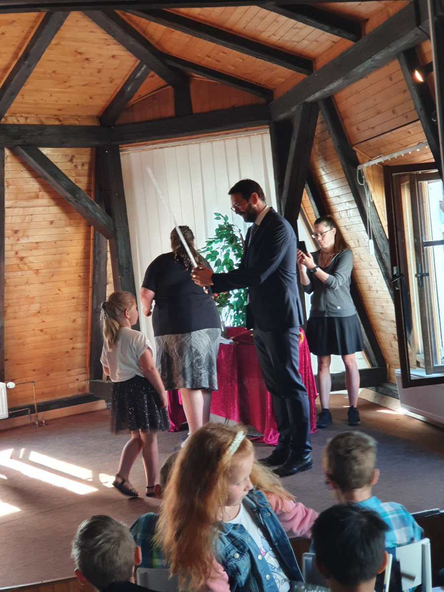 V úterý 14. 6. se v Městské knihovně konala velká sláva. Naši prvňáčci byli pasováni na čtenáře. Tohoto významného slavnostního ceremoniálu se výtečně zhostil pan starosta Patrik Pizinger. Před samotným pasováním všechny pobavilo milé vystoupení dua Dubnička a Lahoda. Pánové zahráli a zazpívali pár písní z vlastní tvorby, které se dětem moc líbily. A pak konečně nastala dlouho očekávaná chvíle. Žáci společně složili slib, že budou dobrými čtenáři a pak jednotlivě chodili k panu starostovi, který je obrovským mečem pasoval na čtenáře. Každý žák si odnesl na památku slib, knížku Dubánci, pár upomínkových předmětů a kartičku čtenáře, s níž mohou děti chodit do knihovny půjčovat si knihy. Po skončení pasování jsme se přesunuli do dětského oddělení, kde si žáci vybrali svou první knihu k vypůjčení.