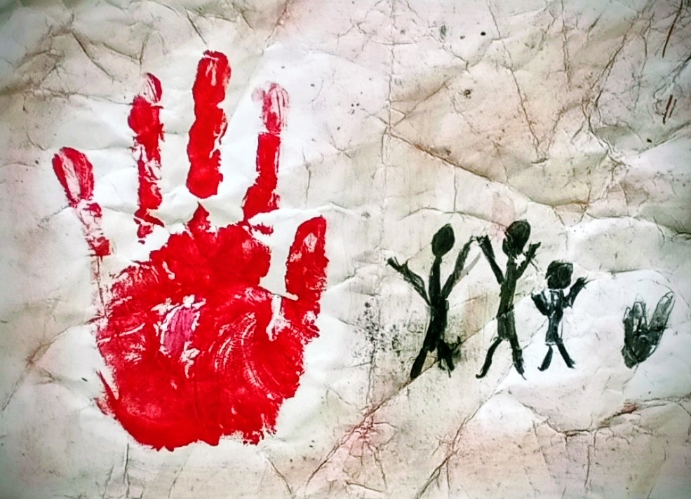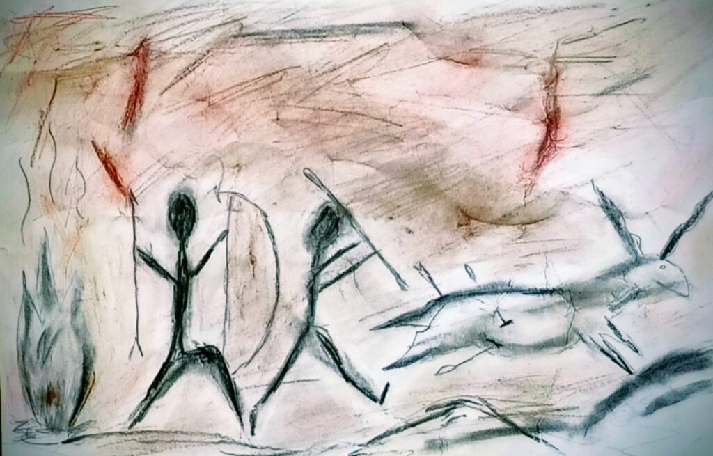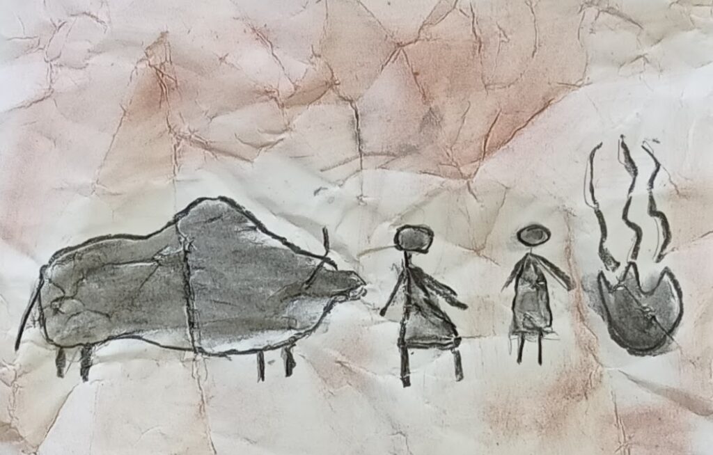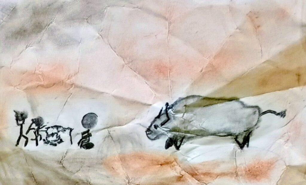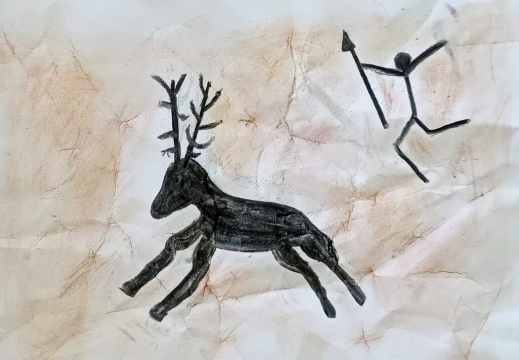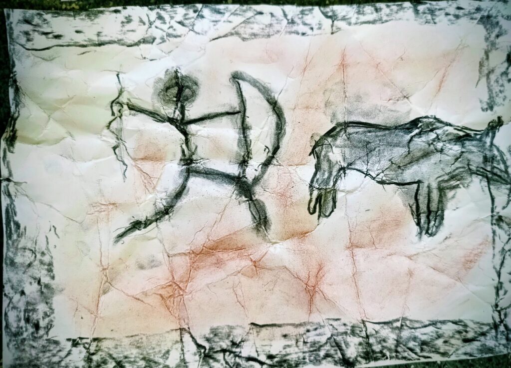 Po malé inspiraci se děti pustily do vlastní tvorby. Na zmačkanou čtvrtku si nejprve tužkou načrtly postavy a zvířata, která chtěly „vytesat“ do své jeskynní stěny. Poté začaly pracovat s materiály, které měly k dispozici – černým uhlem na zvýraznění postav a odřezky z pastelek, jimiž vytvořily barevné pozadí připomínající kouř a hlínu pravěkých ohnišť.