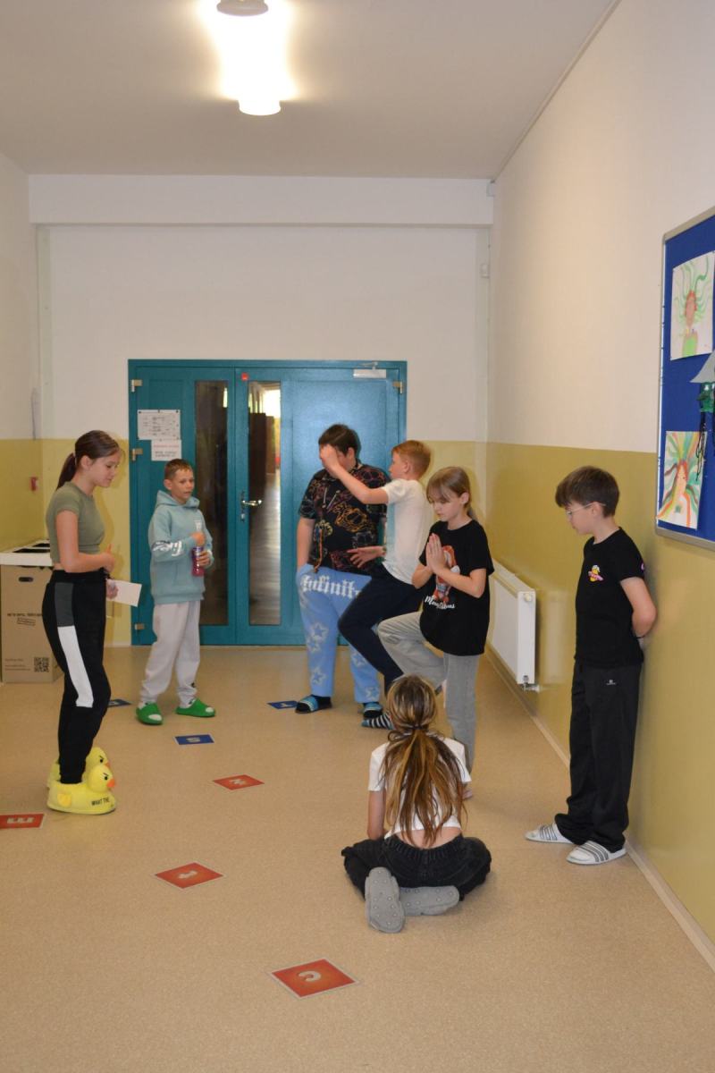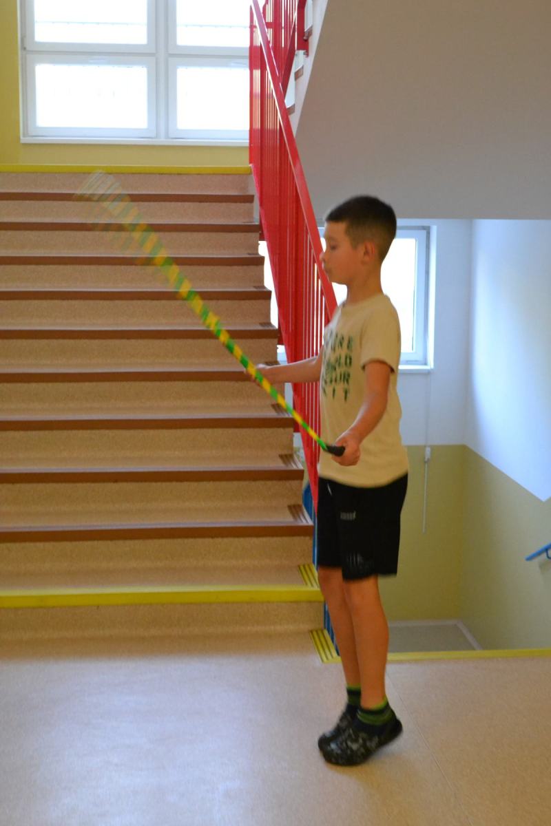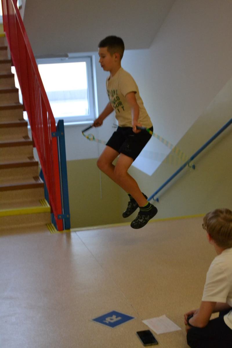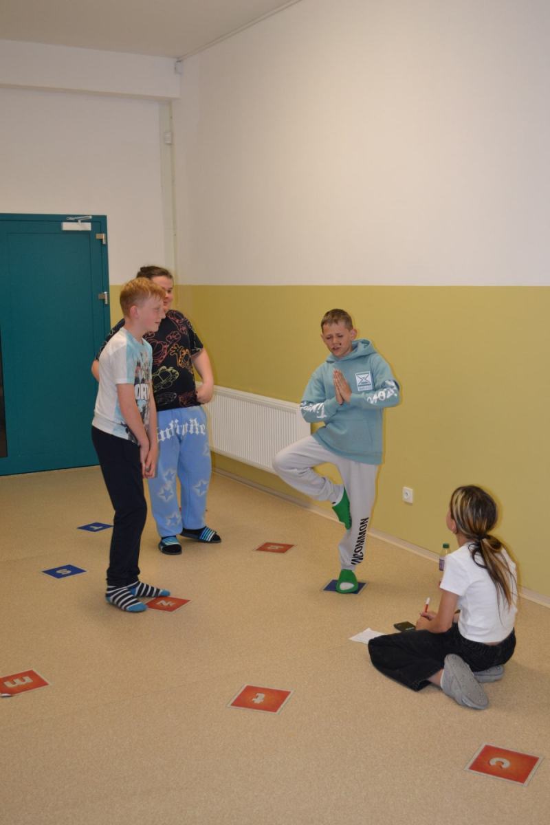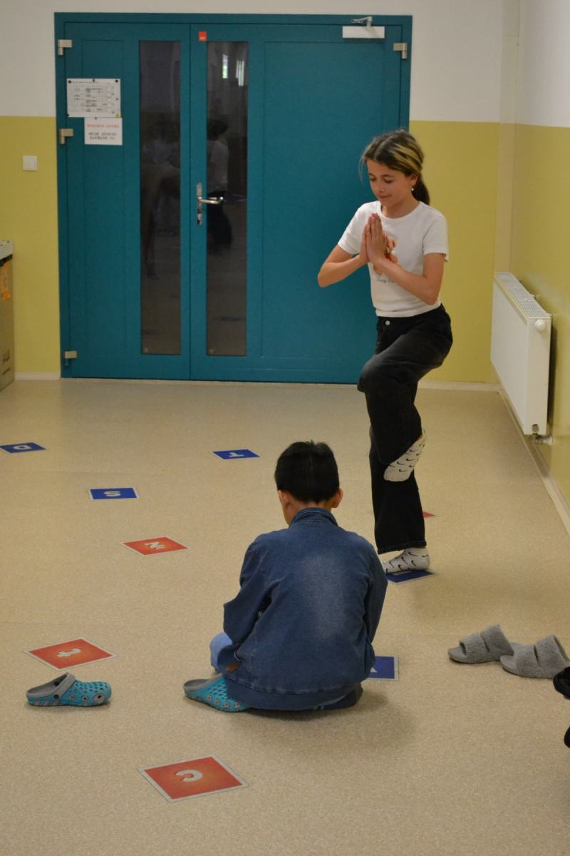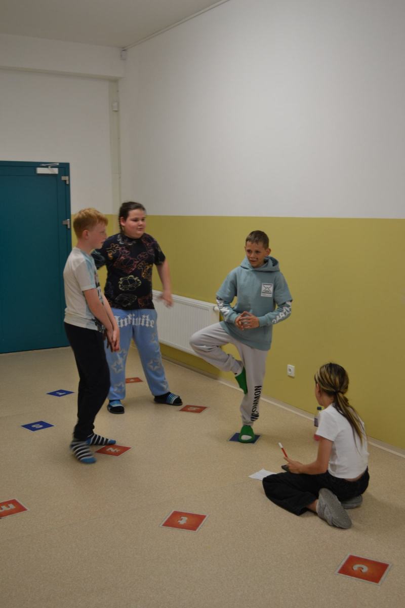 Školáci si pro sebe navzájem připravili soutěžení – skok z místa, skoky přes švihadlo, postoj čápa.