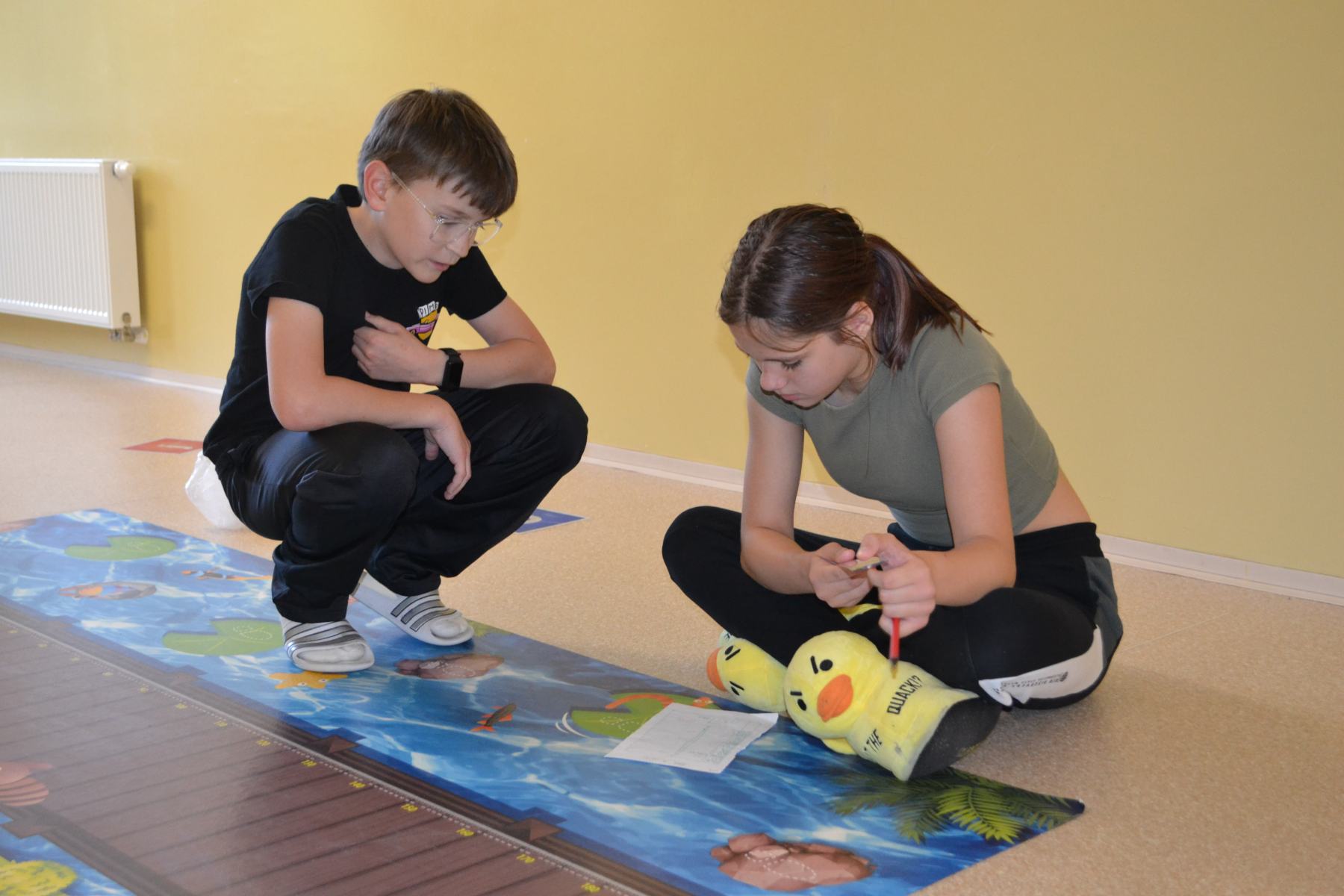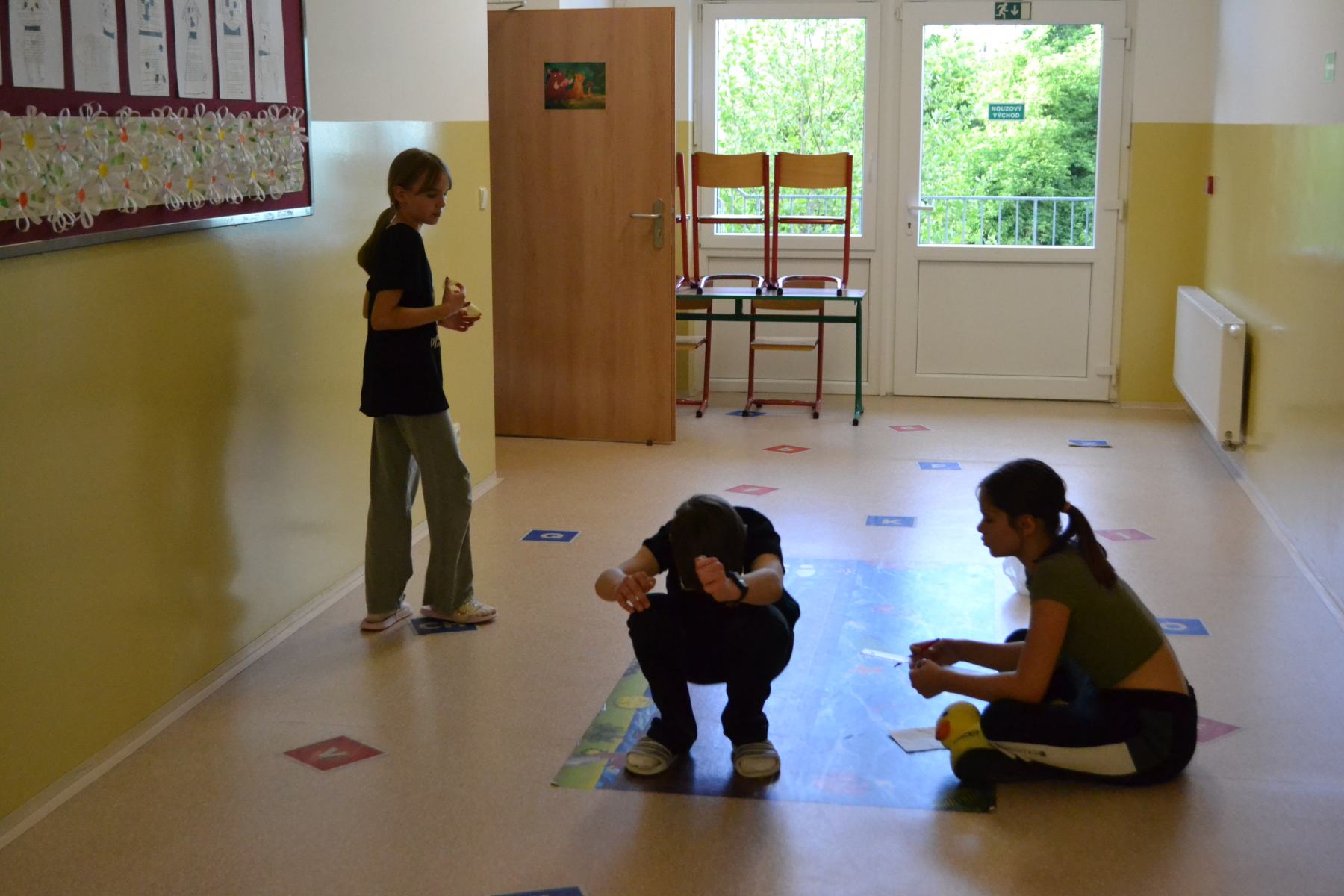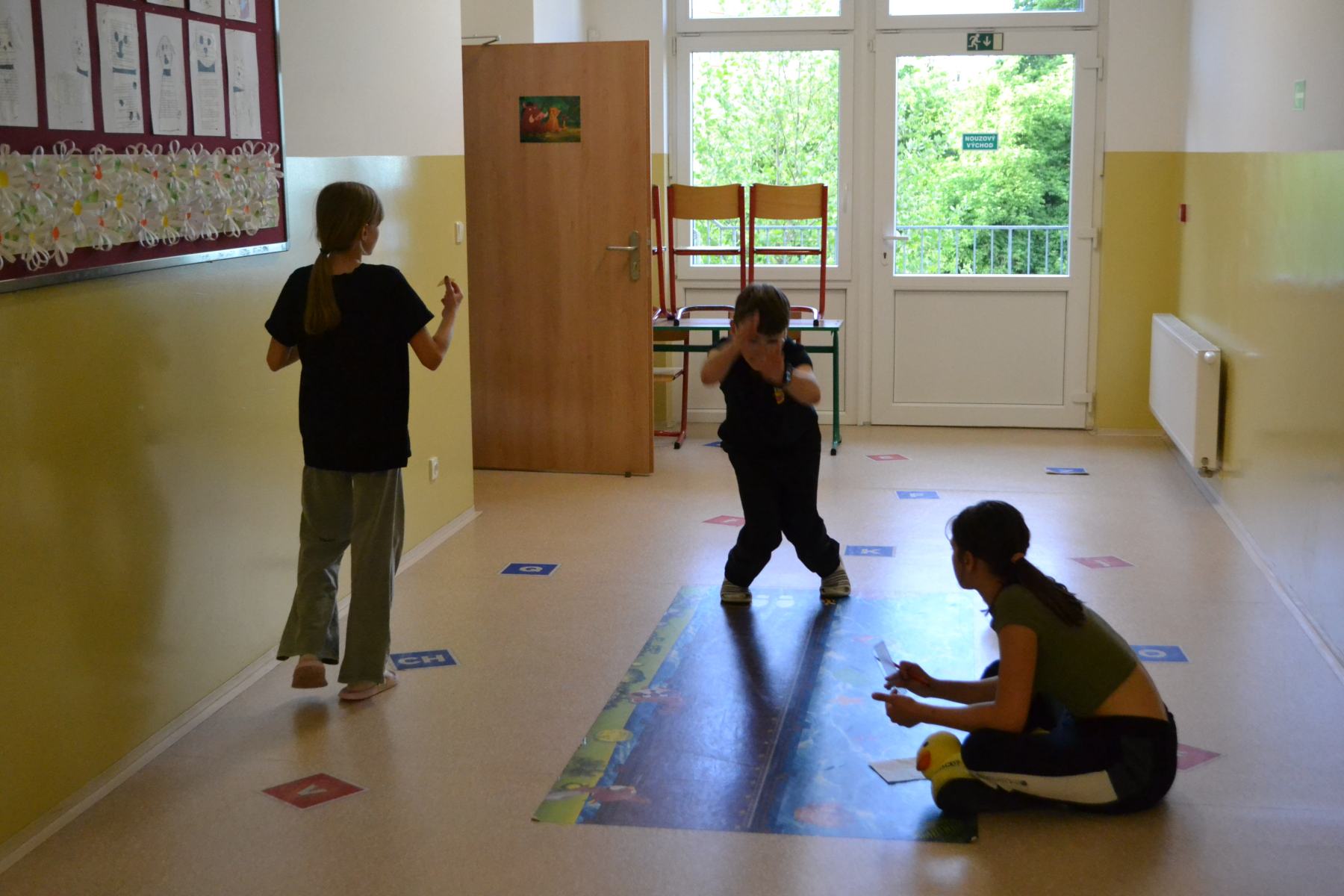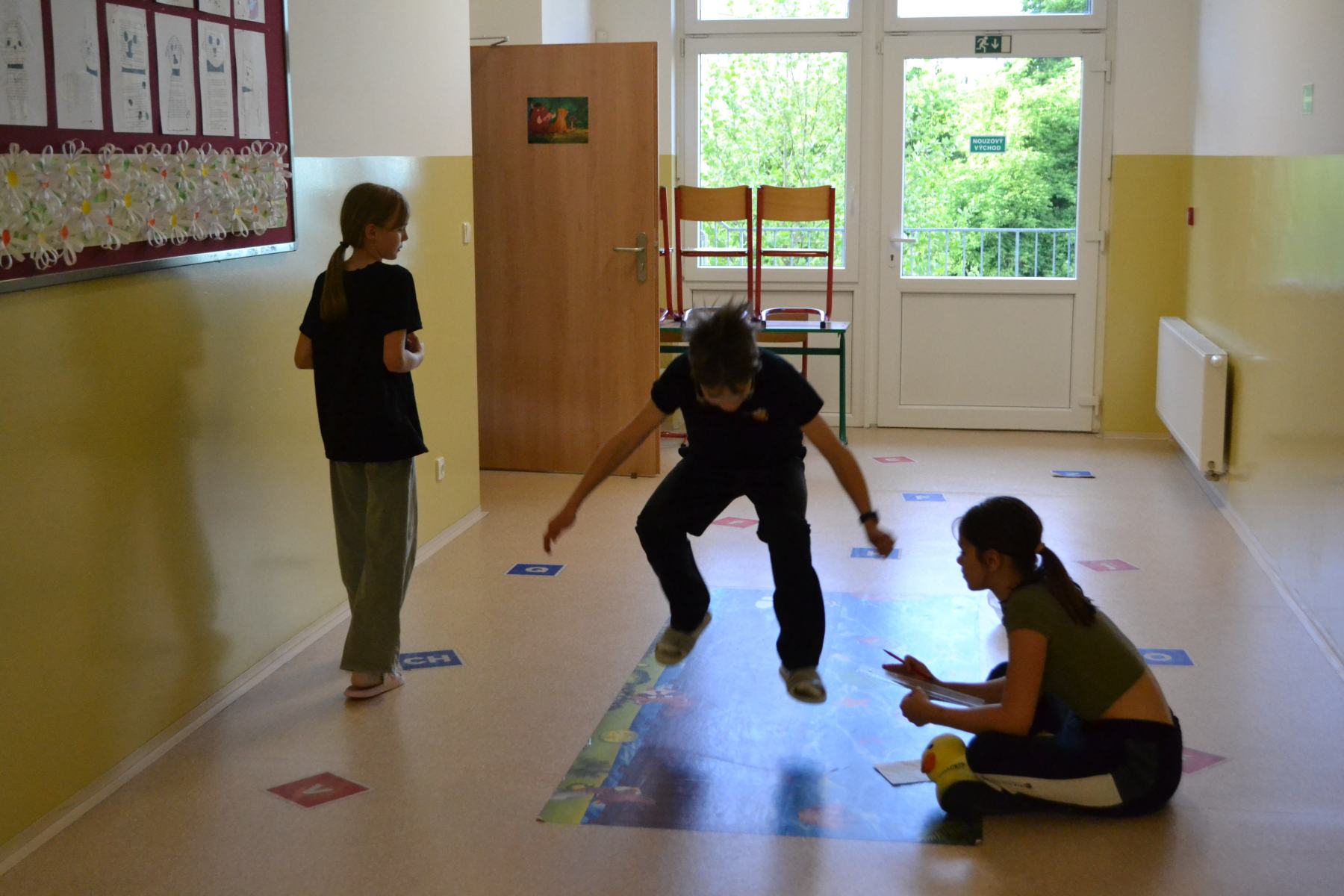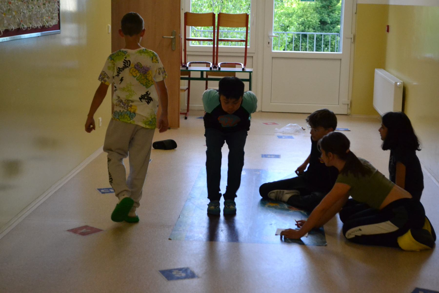 Školáci si pro sebe navzájem připravili soutěžení – skok z místa, skoky přes švihadlo, postoj čápa.