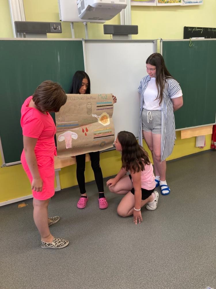 V hodině přírodovědy jsme závěrečné shrnutí pojali formou skupinové práce. Každá skupina dostala téma (smysly, soustavu, kosti a svaly) a měla za úkol vytvořit plakát. Žáci se rozdělili do skupin a na další hodinu si přinesli tematické obrázky a dali se do práce. Pracovali s velikým zaujetím a nadšením. V případě potřeby vše doplnili svým výtvarným projevem. Nakonec svou práci krátce prezentovali. Děti práce bavila a měly ze své tvorby velkou radost.