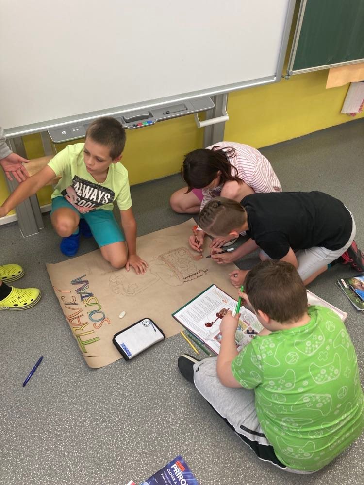 V hodině přírodovědy jsme závěrečné shrnutí pojali formou skupinové práce. Každá skupina dostala téma (smysly, soustavu, kosti a svaly) a měla za úkol vytvořit plakát. Žáci se rozdělili do skupin a na další hodinu si přinesli tematické obrázky a dali se do práce. Pracovali s velikým zaujetím a nadšením. V případě potřeby vše doplnili svým výtvarným projevem. Nakonec svou práci krátce prezentovali. Děti práce bavila a měly ze své tvorby velkou radost.