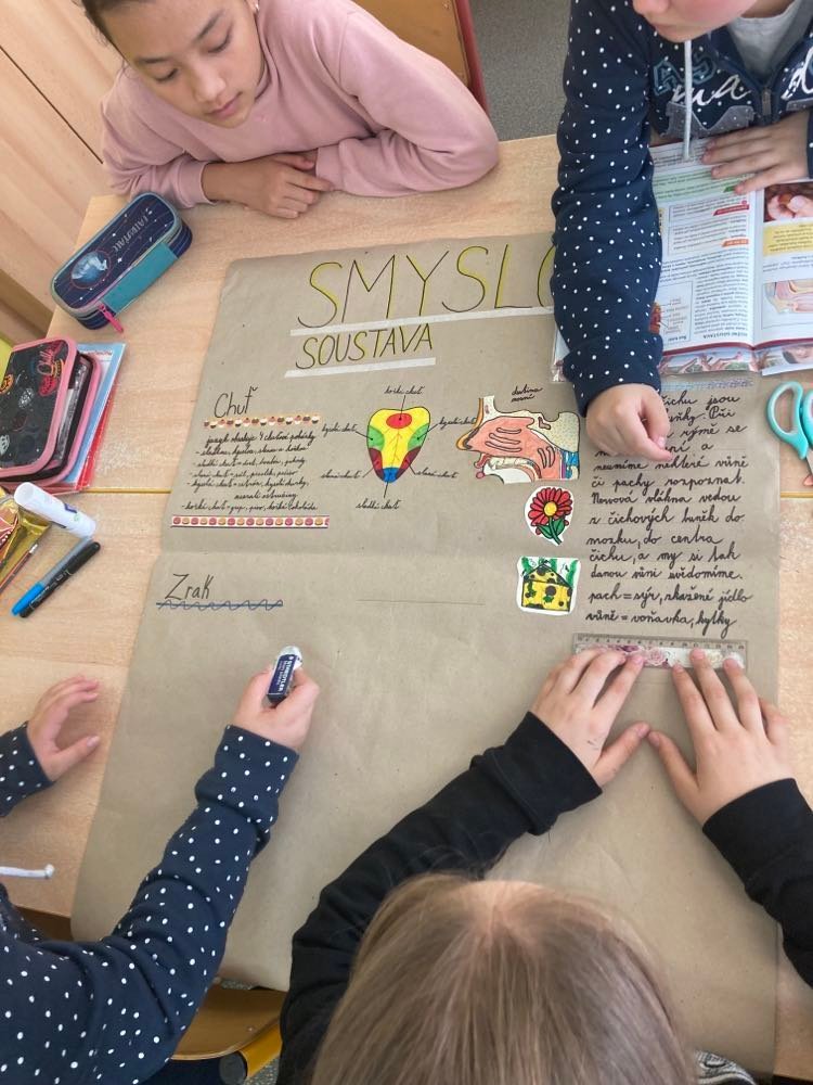 V hodině přírodovědy jsme závěrečné shrnutí pojali formou skupinové práce. Každá skupina dostala téma (smysly, soustavu, kosti a svaly) a měla za úkol vytvořit plakát. Žáci se rozdělili do skupin a na další hodinu si přinesli tematické obrázky a dali se do práce. Pracovali s velikým zaujetím a nadšením. V případě potřeby vše doplnili svým výtvarným projevem. Nakonec svou práci krátce prezentovali. Děti práce bavila a měly ze své tvorby velkou radost.
