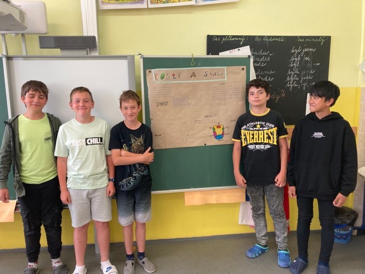 V hodině přírodovědy jsme závěrečné shrnutí pojali formou skupinové práce. Každá skupina dostala téma (smysly, soustavu, kosti a svaly) a měla za úkol vytvořit plakát. Žáci se rozdělili do skupin a na další hodinu si přinesli tematické obrázky a dali se do práce. Pracovali s velikým zaujetím a nadšením. V případě potřeby vše doplnili svým výtvarným projevem. Nakonec svou práci krátce prezentovali. Děti práce bavila a měly ze své tvorby velkou radost.