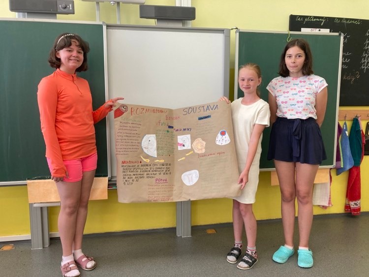 V hodině přírodovědy jsme závěrečné shrnutí pojali formou skupinové práce. Každá skupina dostala téma (smysly, soustavu, kosti a svaly) a měla za úkol vytvořit plakát. Žáci se rozdělili do skupin a na další hodinu si přinesli tematické obrázky a dali se do práce. Pracovali s velikým zaujetím a nadšením. V případě potřeby vše doplnili svým výtvarným projevem. Nakonec svou práci krátce prezentovali. Děti práce bavila a měly ze své tvorby velkou radost.