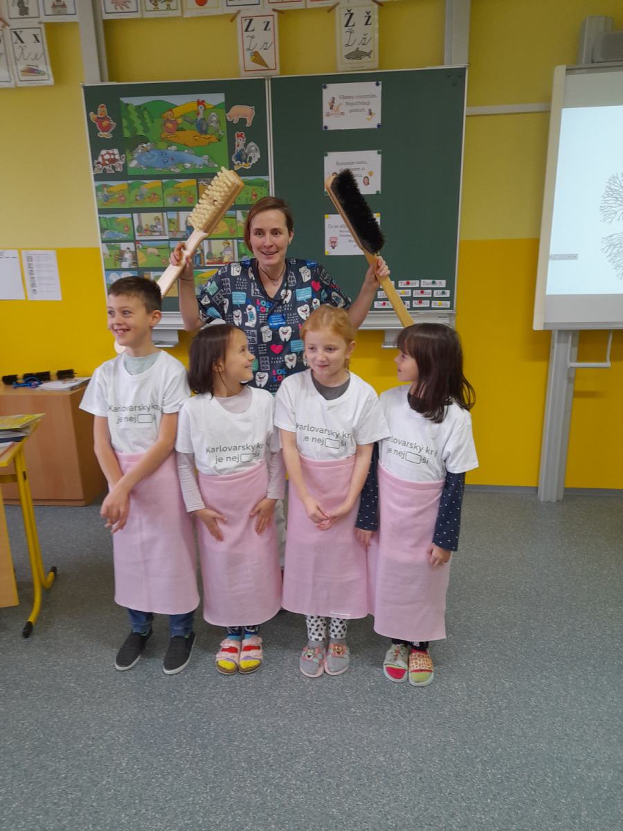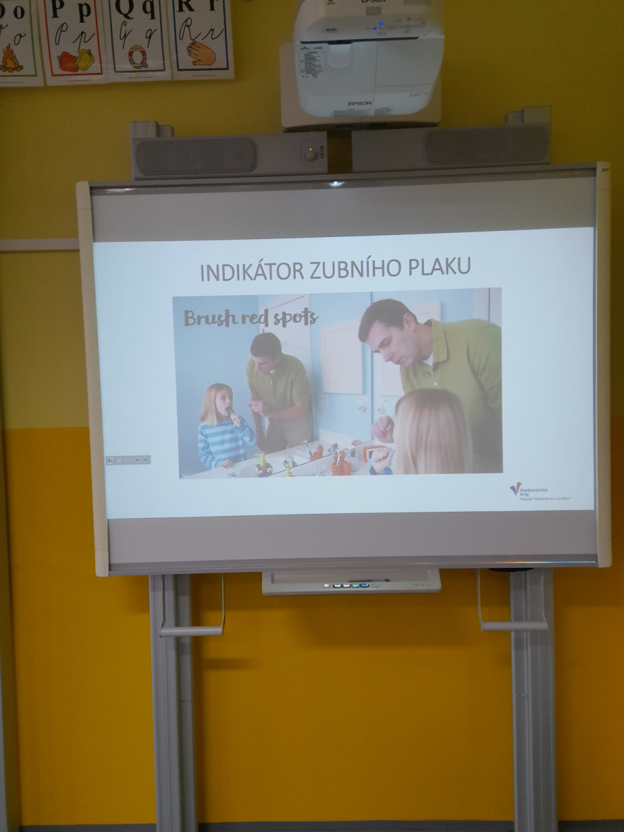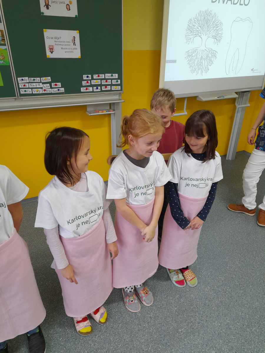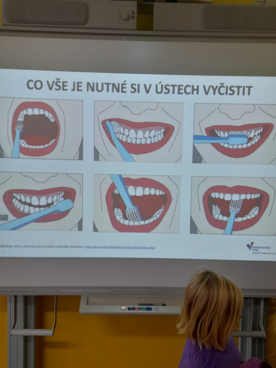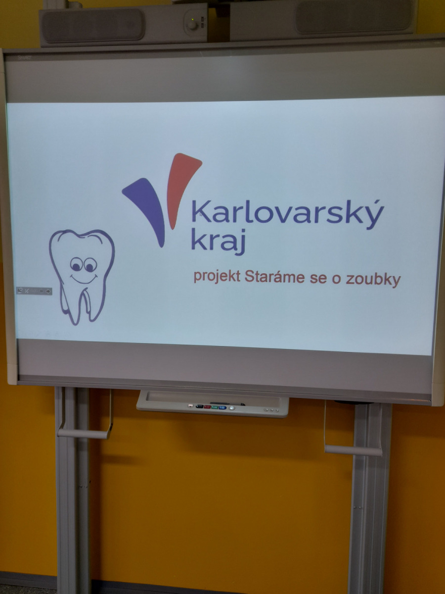V letošním roce na naší škole probíhá projekt Karlovarského kraje „Staráme se o zoubky“. V současné době máme za sebou dvě lekce a ještě nás další dvě čekají ve druhém pololetí. Jedná se o program, který má žáky prvních a druhých tříd naučit starat se o zuby. Paní Svobodová se svou asistentkou humornou formou seznamuje žáky jak se starat o ústní dutinu. Učí je vybrat si správný kartáček, k čemu slouží kartáček mezizubní i dentální nit. Nedílnou součástí je i získat povědomí o zdravých potravinách a potravinách, které našemu chrupu příliš neprospívají. Děti jsou v hodinách nadšené a velice rády se zapojují do všech činností.
