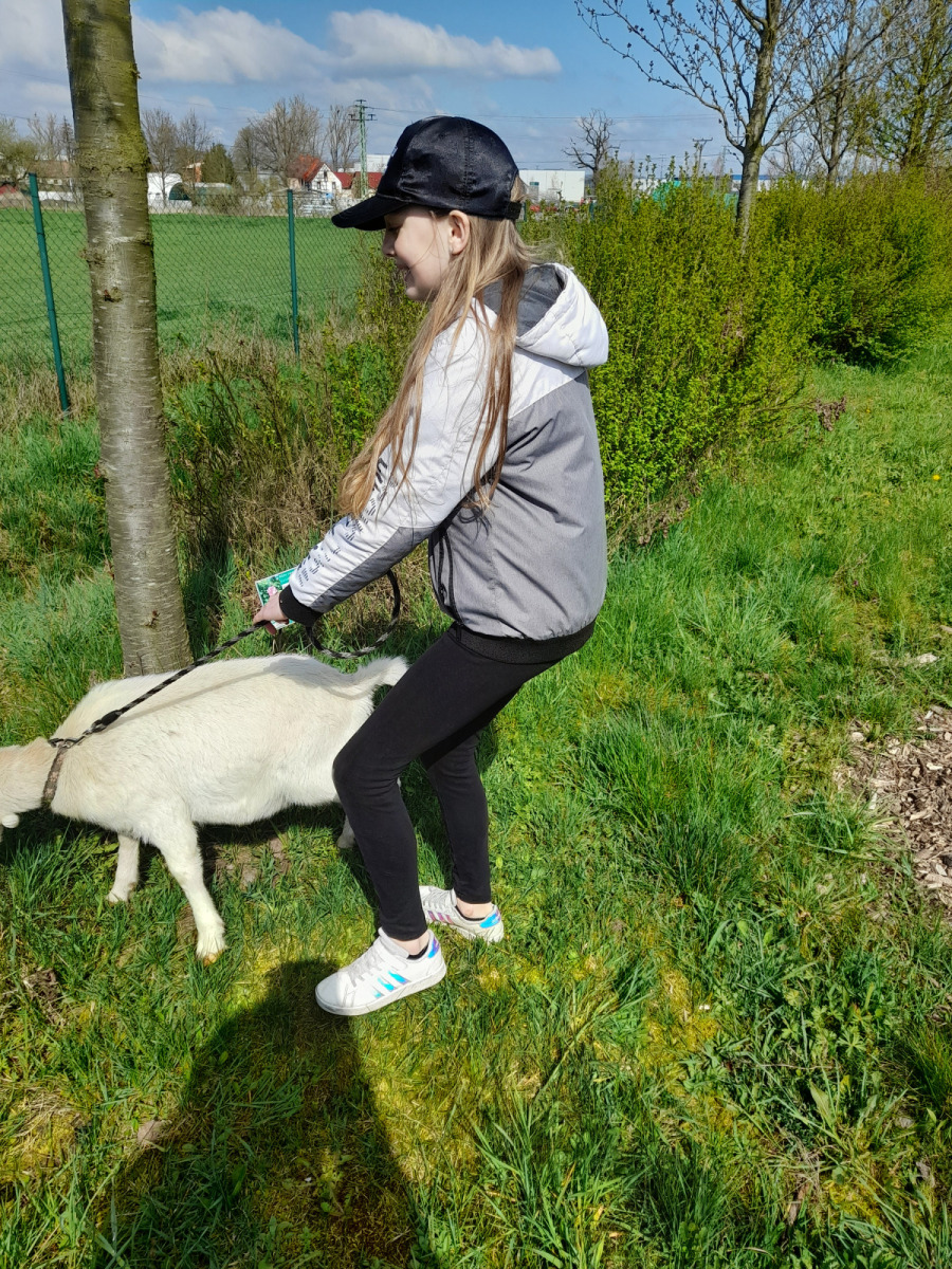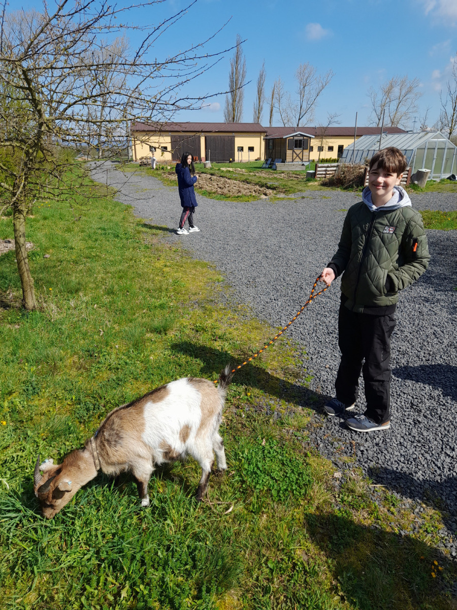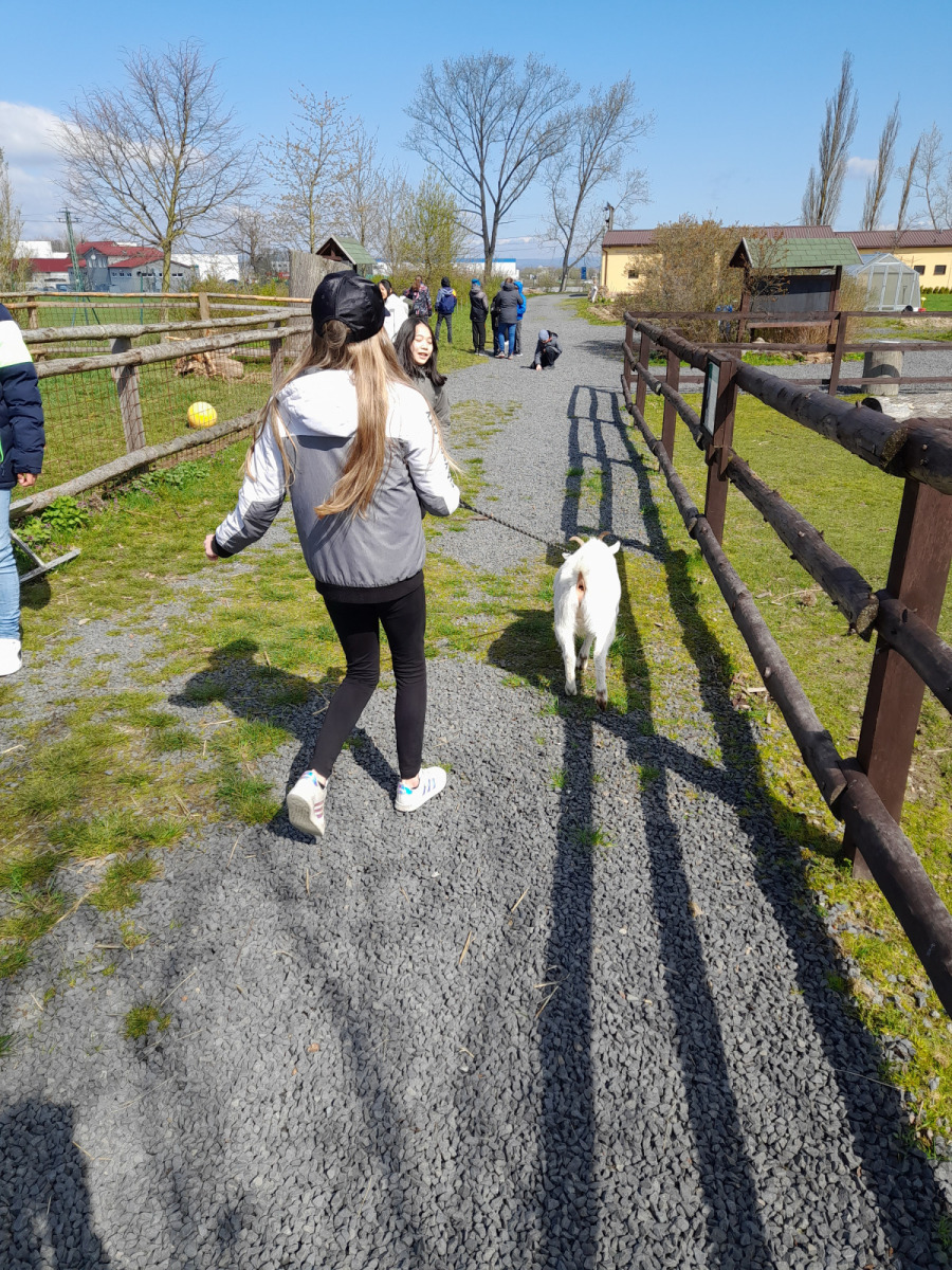 Během pečení jsme si prošli celý statek. Viděli jsme hmyzí hotel, drůbež, králíky i prase, které se od nás nechalo drbat. Také mezi nás přišel mladý býček Kuba. Tomu zachutnaly Maxovy boty. Nedal se od nich odtrhnout. Ještě jsme zvládli pozorovat úplně malá jehňátka a vyvenčit kozy na vodítku. Pak už jsem jen snědli naše výtvory a jeli zpět do školy.