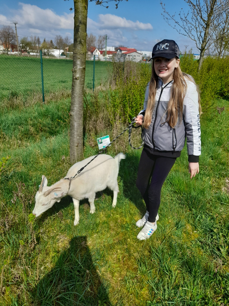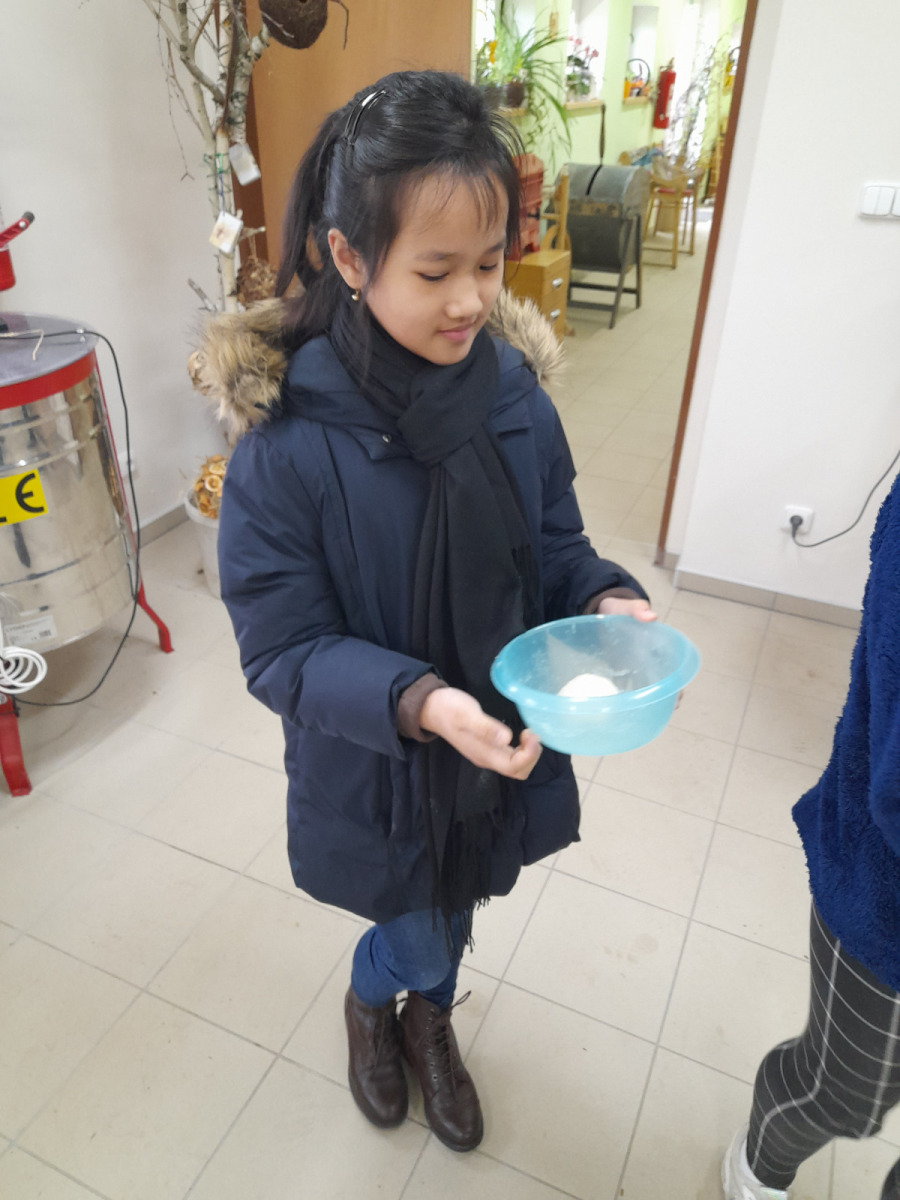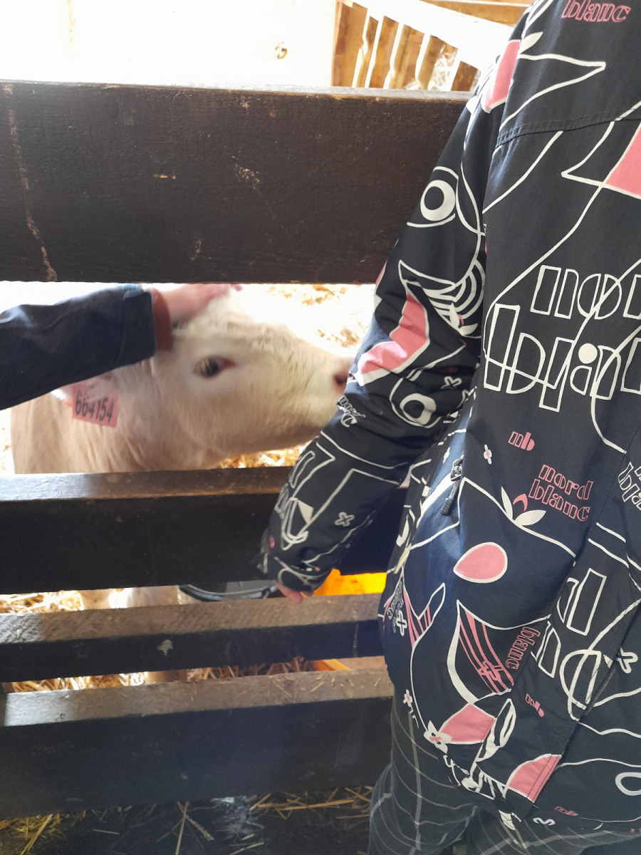 Během pečení jsme si prošli celý statek. Viděli jsme hmyzí hotel, drůbež, králíky i prase, které se od nás nechalo drbat. Také mezi nás přišel mladý býček Kuba. Tomu zachutnaly Maxovy boty. Nedal se od nich odtrhnout. Ještě jsme zvládli pozorovat úplně malá jehňátka a vyvenčit kozy na vodítku. Pak už jsem jen snědli naše výtvory a jeli zpět do školy.